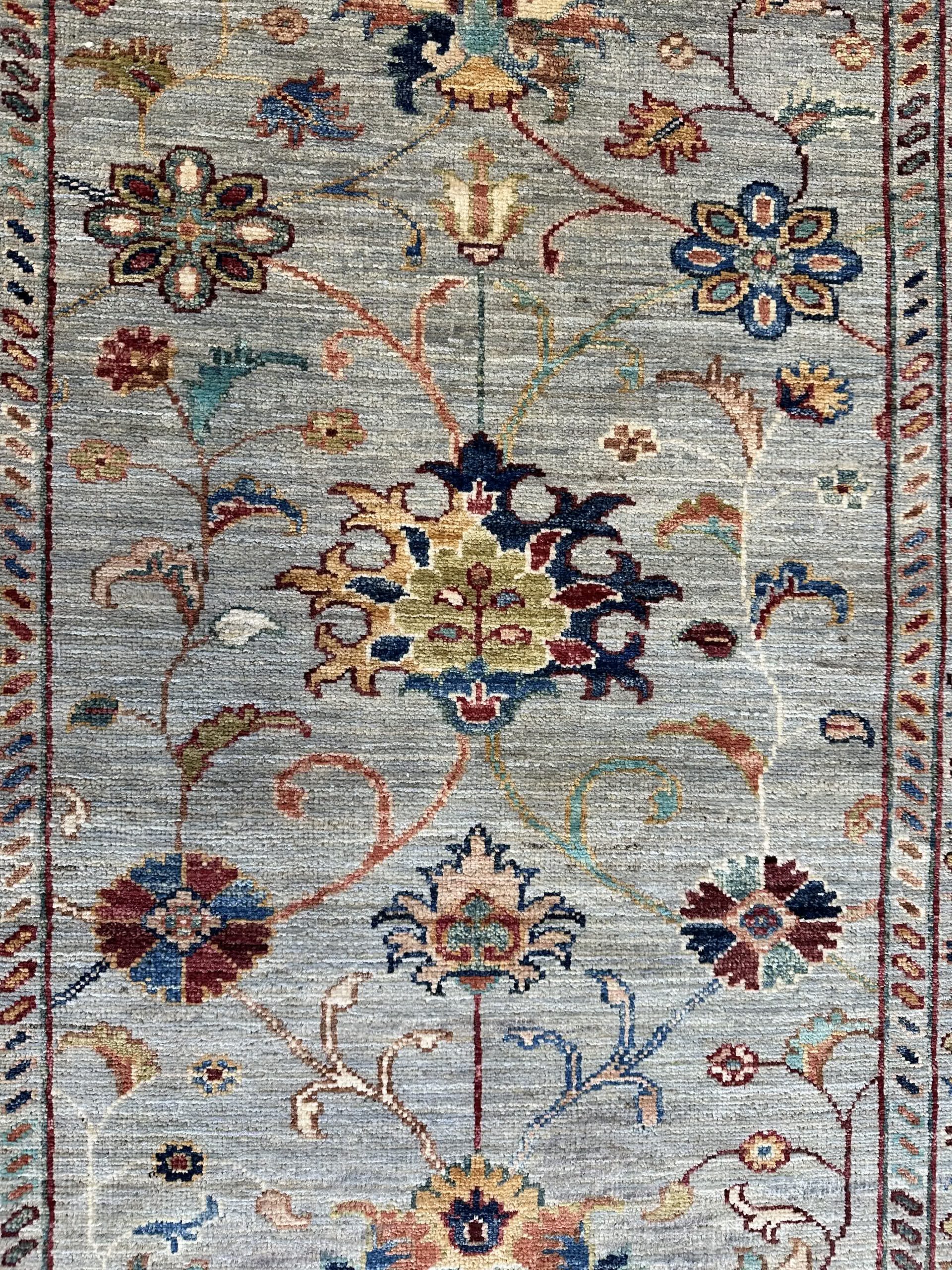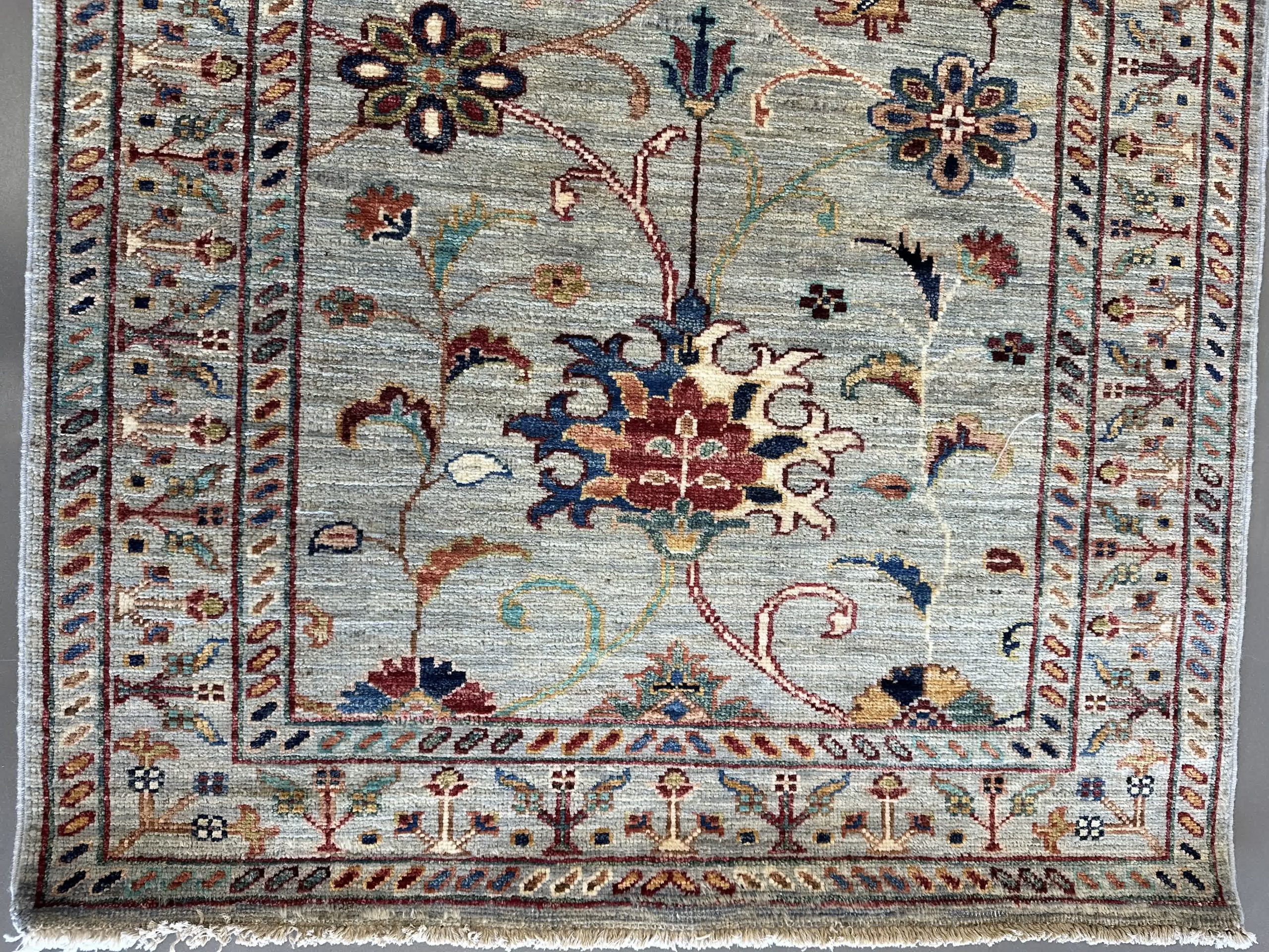 This hand knotted Pakistan tribal rug lends a traditional feel to your favorite room. It carries floral design elements along with a pleasing balance of green, red and blue colors.