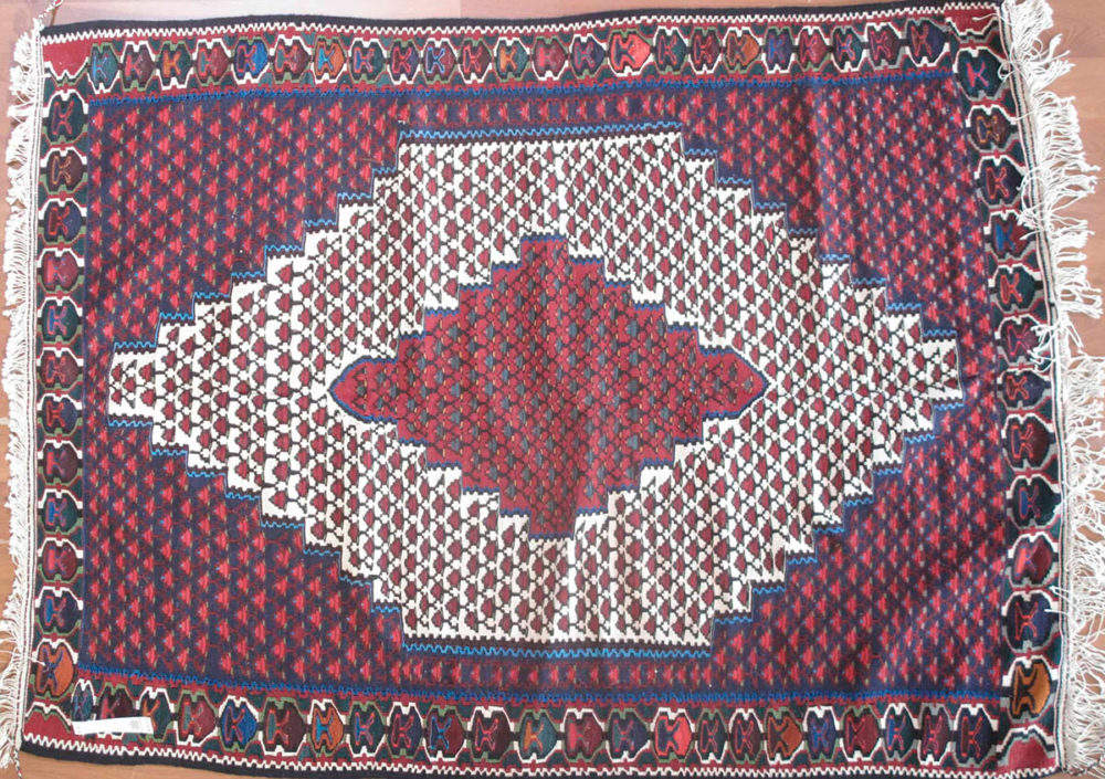 This handwoven Persian rug lends a kilim feel to your favorite room. It has geometric motifs along with a pleasing balance of black & red colors