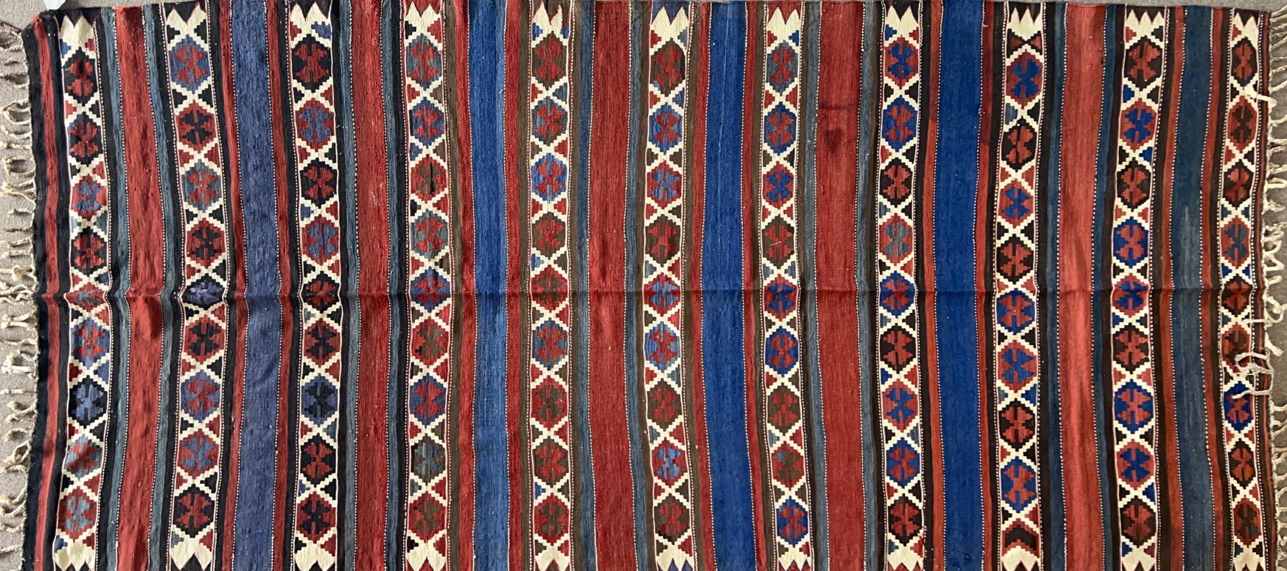 This hand knotted Caucasian rug lends a kilim feel to your favorite room. It carries striped design elements along with a pleasing balance of red and blue colors.